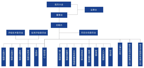 公司組織機構(gòu)健全,設(shè)有總裁辦公會、信用評級委員會、評級技術(shù)委員會、風(fēng)控合規(guī)委員會。公司下設(shè)工商評級部、公用評級部、金融評級部、結(jié)構(gòu)評級部、主權(quán)部、研究中心、核心市場部、區(qū)域市場部、合規(guī)質(zhì)量管理部、信息技術(shù)部、投資人服務(wù)部、財務(wù)部、人力資源部、綜合部等業(yè)務(wù)和職能部門。公司下設(shè)兩家全資子公司與一家分公司,分別為:聯(lián)合評級國際有限公司、聯(lián)合信用評級有限公司、聯(lián)合資信評估股份有限公司上海分公司。